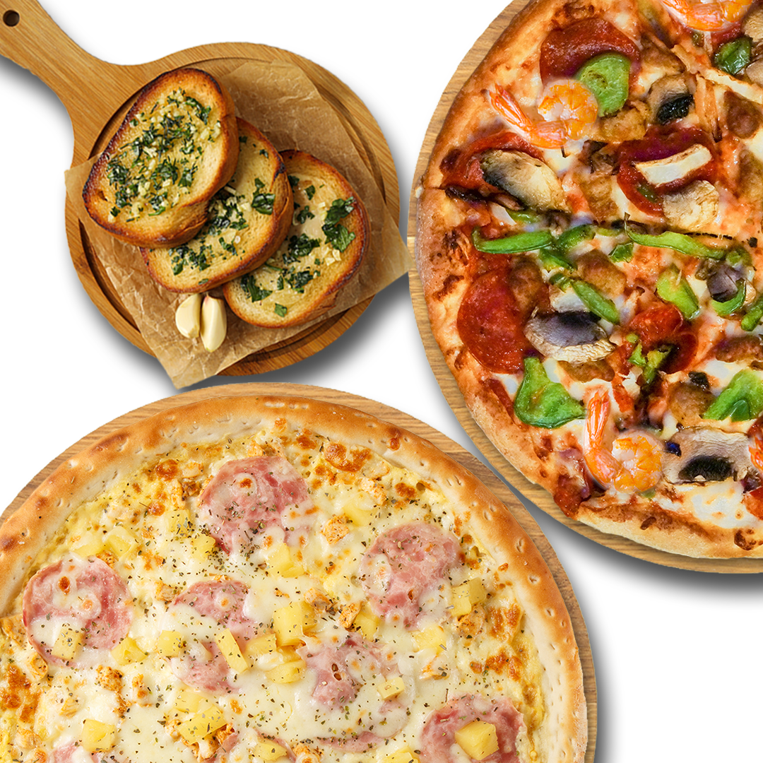 Tomato sugo, ham, mushroom, capsicum, onion, olives, pineapple, shrimps, mozzarella