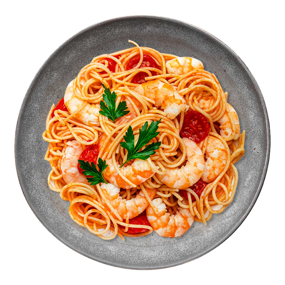 Tomato sugo, mozzarella, ham, mushrooms & shrimps